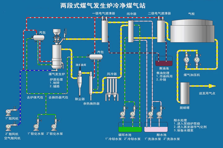 煤氣發(fā)生爐的工藝流程是由來自鼓風(fēng)機的空氣與爐體自產(chǎn)的蒸汽混合成飽和空氣作為氣化劑,經(jīng)止回閥通過煤氣爐底部進入煤氣爐內(nèi);塊煤粒度25-50mm30-60mm或40-80mm,由煤炭提升裝置,經(jīng)加煤裝置加入到煤氣爐內(nèi);在煤氣爐內(nèi)產(chǎn)生的煤氣經(jīng)過重力除塵、旋風(fēng)除塵器除塵后,通過煤氣管道輸送至用戶。如果用戶需要冷煤氣,需要增加雙豎管、洗滌塔、電捕焦油器、捕滴器、脫硫塔、加壓機通過煤氣管道輸送至用戶。
