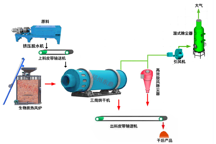 東鼎啤酒糟烘干機(jī)生產(chǎn)線主要由供脫水設(shè)備、熱源、上料機(jī)、進(jìn)料機(jī)、回轉(zhuǎn)滾筒、出料機(jī)、引風(fēng)機(jī)、卸料器和配電柜、粉碎系統(tǒng)、打包系統(tǒng)等部件構(gòu)成;具體工藝如下水分含量高達(dá)80%以上的濕酒糟經(jīng)脫水設(shè)備擠壓脫水后水分降到65%左右,然后經(jīng)螺旋上料機(jī)進(jìn)入干燥系統(tǒng),在干燥滾筒內(nèi)均布的抄板翻動下,進(jìn)行均勻分散與熱空氣充分接觸,加快了烘干傳熱、傳質(zhì)。目前我司針對不同狀態(tài)的酒糟物料開發(fā)了三筒酒糟烘干機(jī)、內(nèi)置打散裝置酒糟烘干機(jī)解決方案,并配套潔凈環(huán)保的熱工除塵設(shè)備滿足不同客戶需求。